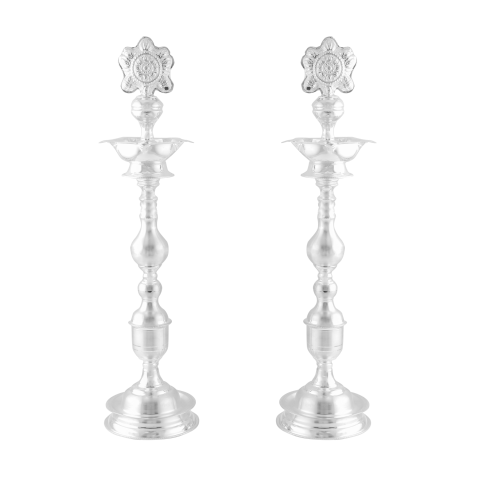 Illuminate your sacred space with this elegant 925 Pure Silver Diya Lamp Pair, beautifully handcrafted in a traditional design. These tall silver lamps feature intricate detailing on the top and a sturdy, well-balanced base, making them perfect for daily pooja rituals, temple use, and festive celebrations. Made from authentic 925 sterling silver, these diyas symbolize purity, prosperity, and divine light. Their timeless design enhances the spiritual ambiance of your home and makes them a meaningful addition to any prayer room or altar. Ideal for festivals, weddings, housewarmings, and gifting, these silver lamps bring a blend of tradition, elegance, and devotion to every occasion.