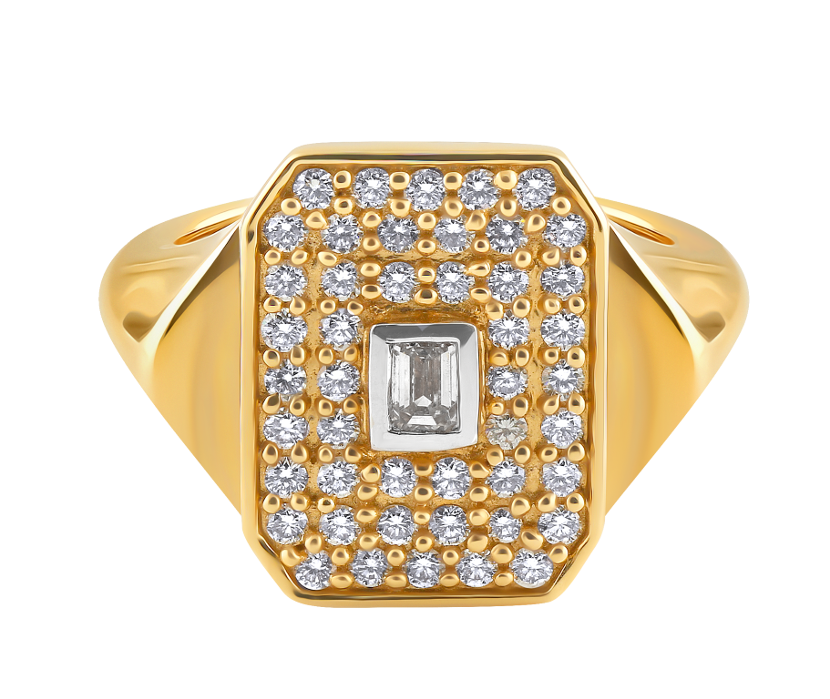 Designed for those who command attention, this gold pinky ring features a royal grid of brilliant diamonds centered around a statement stone — blending modern elegance with timeless authority.