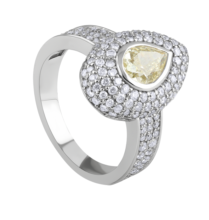 Elevate your elegance with this stunning pear-shaped yellow diamond pinky ring, crafted in luxurious 18k white gold. The vibrant yellow diamond radiates captivating brilliance, making it a perfect statement piece for any outfit. Indulge in this exceptional ring and let your fingers shine with unparalleled glamour.