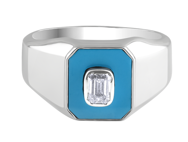 A bold pinky ring featuring an emerald-cut diamond set in a sleek blue ceramic frame, designed for a modern and confident look.