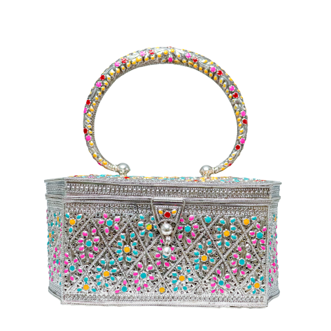A stunning 925 pure silver designer handbag crafted with intricate traditional filigree work and adorned with vibrant multicolor stones. The elegant circular handle and detailed patterns add a luxurious and artistic touch to the design. Perfect for weddings, festive celebrations, and special occasions, this handcrafted silver handbag is a timeless statement piece that reflects elegance and fine craftsmanship.